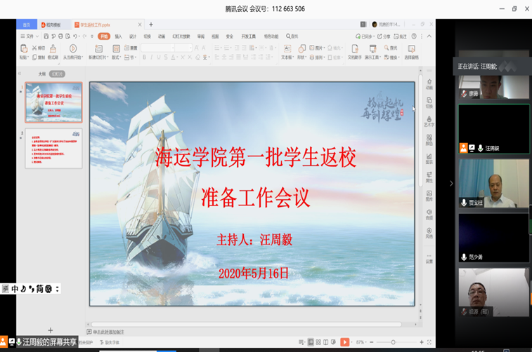 5月16日,上午10时,我院返校学生防疫工作领导小组通过腾讯会议平台,召开第一批返校学生工作会议。工作小组全体人员、第一批返校全体学生参加会议,会议由汪周毅副书记主持。