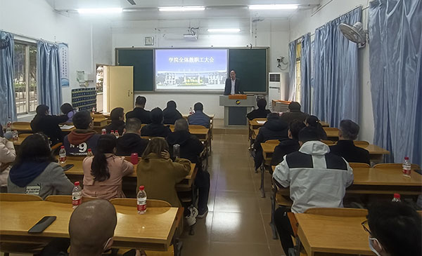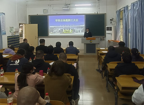 在海滨校区教学楼102教室召开全体教职工大会。学院党政领导、全体教职工参加会议,会议由学院院长贾宝柱主持。
