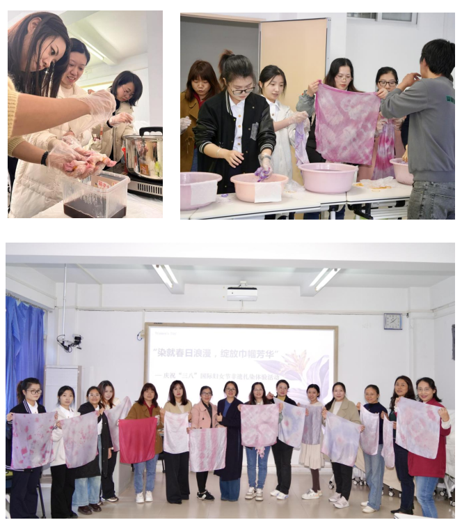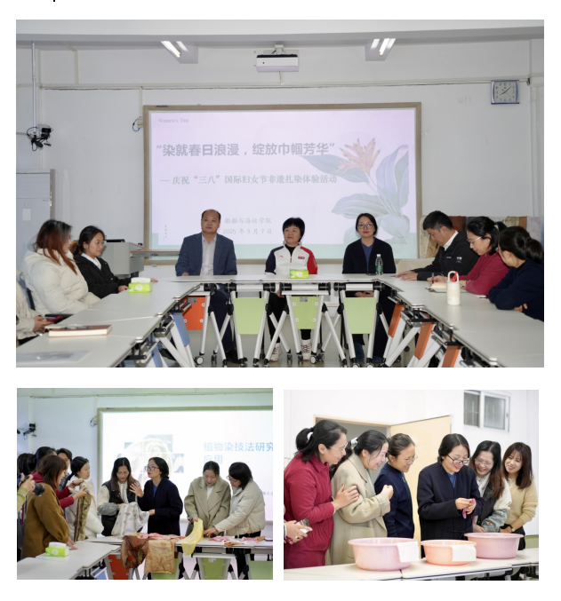 在海滨校区实验楼智慧教室组织开展了以“染就春日浪漫,绽放巾帼芳华”为主题的非遗扎染体验活动。学院党委书记邓朝晖,院长贾宝柱,党委副书记、工会主席齐昊、工会副主席刘抒睿,岭南师范学院植物染非遗文创工作室负责人谭永定,以及学院女教职工和女学生代表30余人参加了体验活动,活动由工会主席齐昊主持。