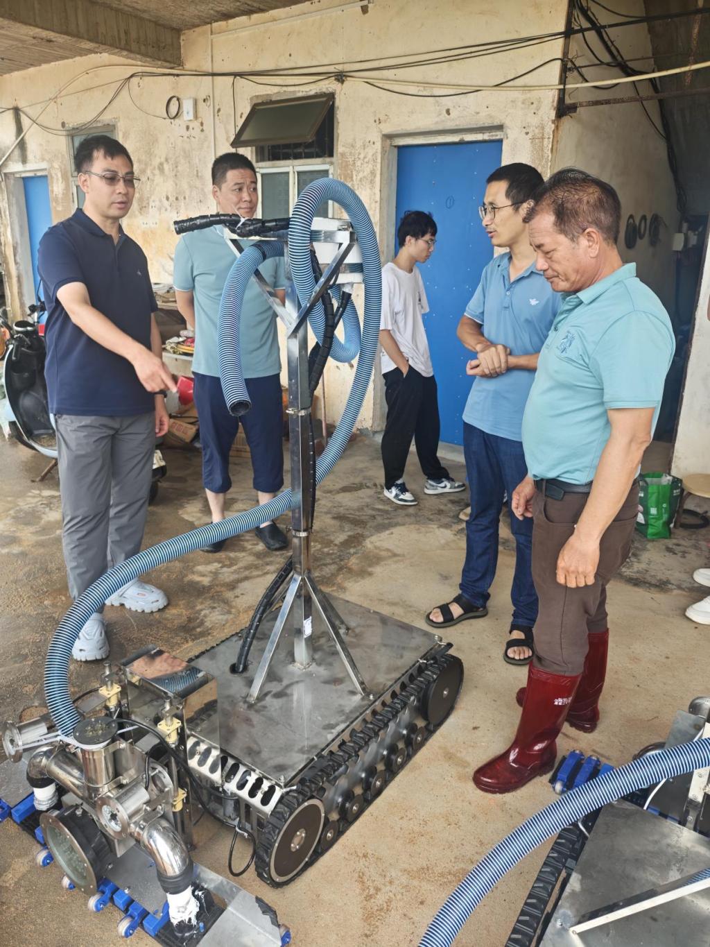 活动中,陈庆龙详细介绍了水下机器人的技术参数及应用功能。随后,该水下机器人在海山村港乐养殖场进行实地试用,帮助养殖户实时检测对虾的养殖状况。最后,陈庆龙及其团队听取了养殖户对于水下机器人使用的反馈意见,并就其升级改造问题进行了深入探讨。