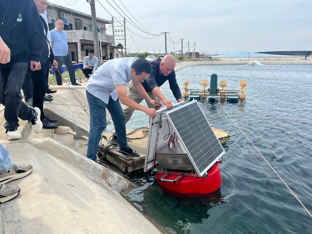 吕文刚副教授给当地养殖户进行了东风螺养殖技术的培训,陈庆龙汇报了智慧池塘技术的阶段性成果,详细介绍了水下机器人、自动化投料船、水质检测设备等相关研究进展。最后,相关设备在海山村港乐养殖场进行实地试用,帮助养殖户实时检测石斑鱼的养殖状况,双方就设备的升级改造问题现场进行了深入探讨。