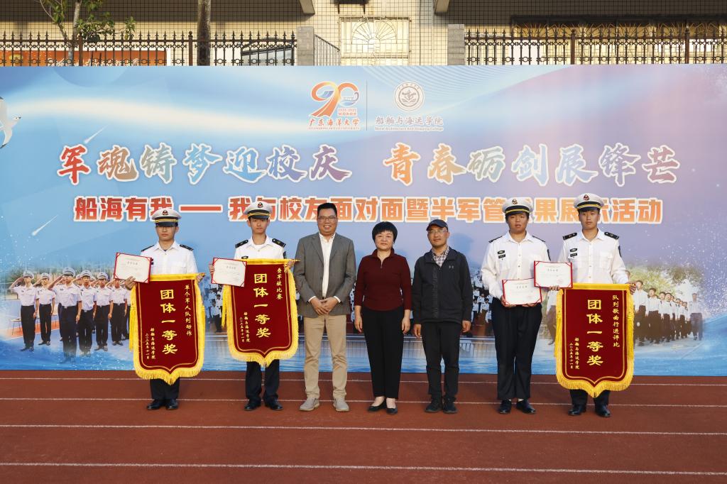 首先,2025级航海类专业学生进行了队列歌曲行进评比、单个军人队列动作和叠军被三项竞赛,用日常训练成果向建校90周年献上了一份特殊的贺礼。随后,邓平贵宣读了获奖名单,校友代表等为获奖集体和个人进行了颁奖。