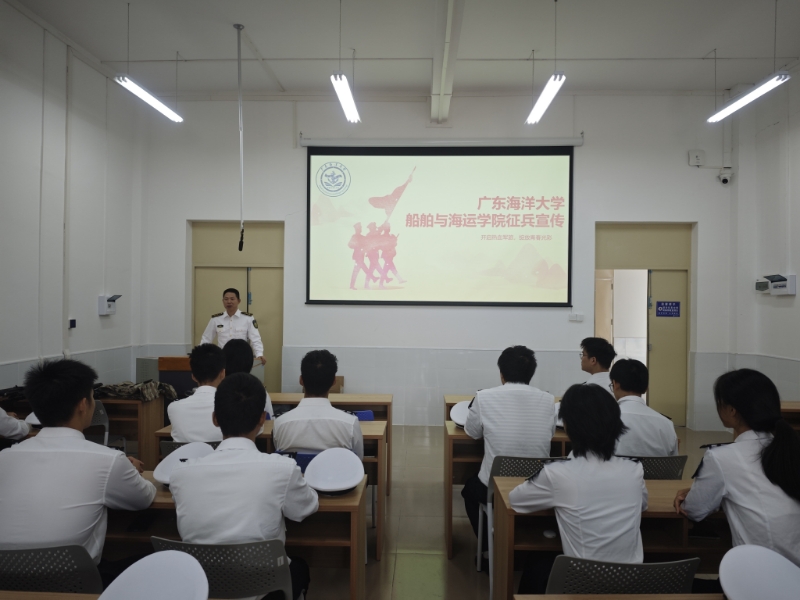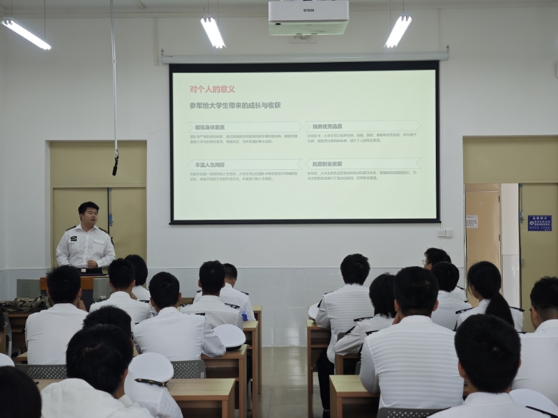 为落实我校兵员预征预储工作,营造参军报国的浓厚氛围,引导船海学子积极服务国防、投身强军事业,11月30日上午,船舶与海运学院在海滨校区济海楼1号教室组织2026年春季征兵宣传会,学院兼职武装干部、半军管大队长江涛、预征预储船海中队全体人员及志愿入伍毕业生50余人参加活动,活动由预征预储船海中队副中队长王玉堃主持。