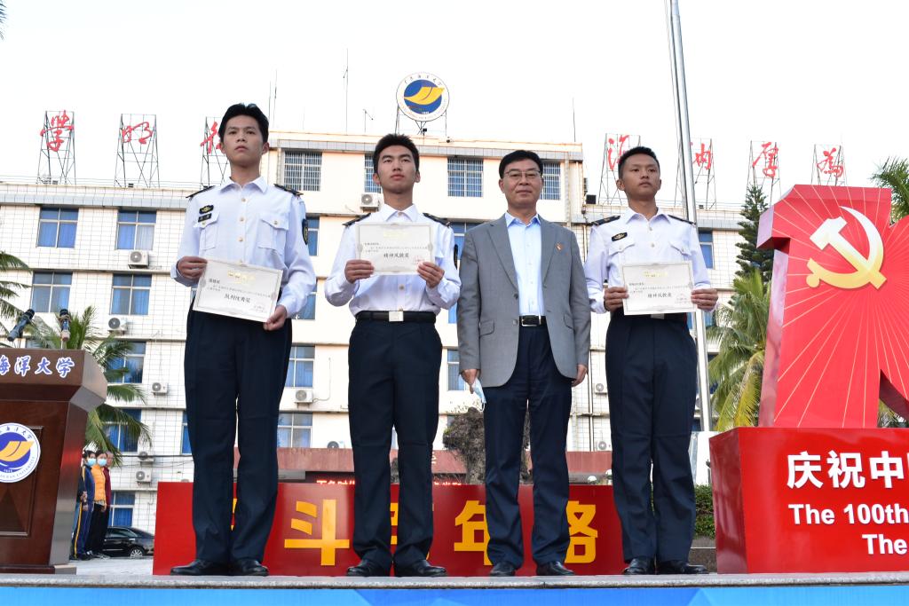 升旗活动中,林常委受邀为学院半军事化管理11月份队列训练先进单位:国旗班、轮机1211区队、船电1212区队进行了颁奖。