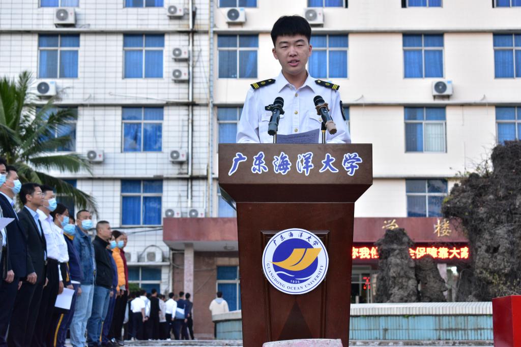 航海1191区队杨纪元同学作为学生代表进行了发言:身为当代大学生,我们应该把当担意识内化于心、外化于行,把使命放在心上、责任扛在肩头,以永不懈怠的精神状态和一往无前的奋斗姿态,继续朝着中华民族伟大复兴的宏伟目标奋勇前进。