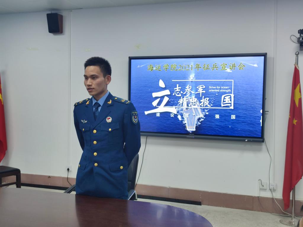 会议首先观看2021年各军兵种征兵宣传视频。江涛详细介绍了2021年“一年两征”的新政策变化,根据近年来学院参军入伍的实际情况认真帮大家分析问题,对军、地、校各项优惠政策进行了详细的讲解,并且鼓励同学们敢于挑战、敢于磨炼,为国防建设做出自己的贡献。同学们热情高涨,积极提问,纷纷发表自己的参军志向。此次会议还邀请了今年退伍复学的2019级轮机工程许健、梁嘉成两位同学来分享他们的军旅生涯:大学生作为未来的国家栋梁,应做到刻苦学习掌握知识本领,树立坚定的理想信念和人生目标;更应该把参军入伍、保家卫国作为青春的历练和责任。