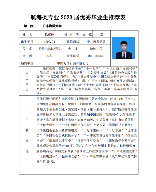 通过组织航海类专业毕业生个人申报、材料审查和会议讨论推荐,最终确定推荐航海1191班聂杰智和轮机1191班徐茂栋两名同学,现予以公示。
