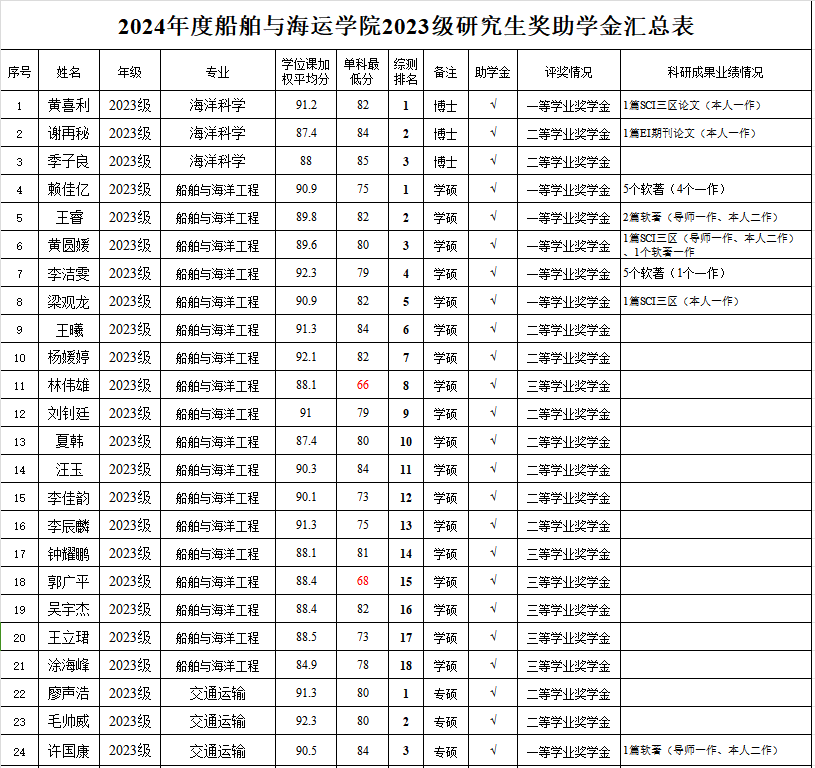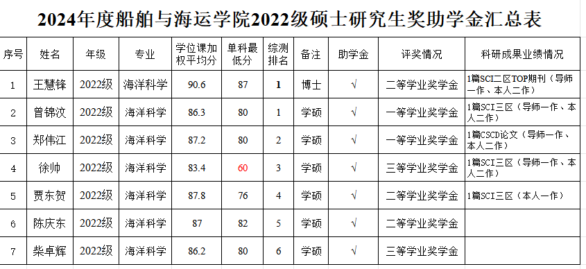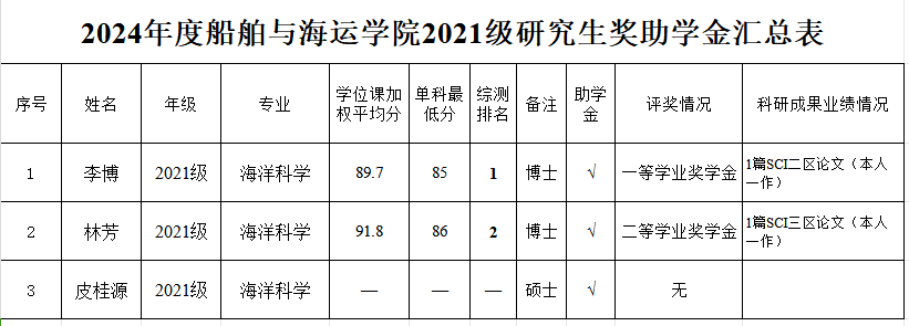 全日制研究生奖助学金实施办法》,经个人申请、学院评审小组认真审核及严格评选,拟确定获得研究生助学金、学业奖学金人员名单。其中,2021级海洋科学专业皮桂源同学因休学补发半年助学金,其余硕士研究生均不分等级全部获得助学金。现将评审名单进行公示(详见附表)。