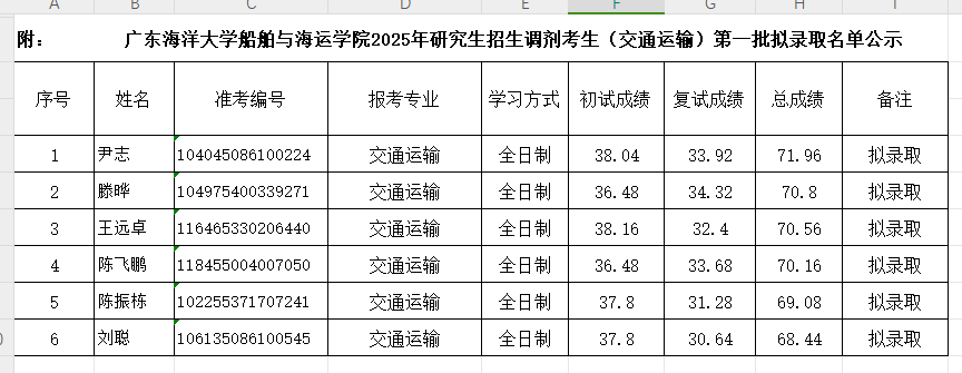 根据番茄社区 及我院研究生招生工作的相关文件精神和要求,经学院研究生招生录取工作领导小组审定,将我院2025年硕士研究生招生调剂(交通运输)第一批考生复试成绩及拟录取名单公示。