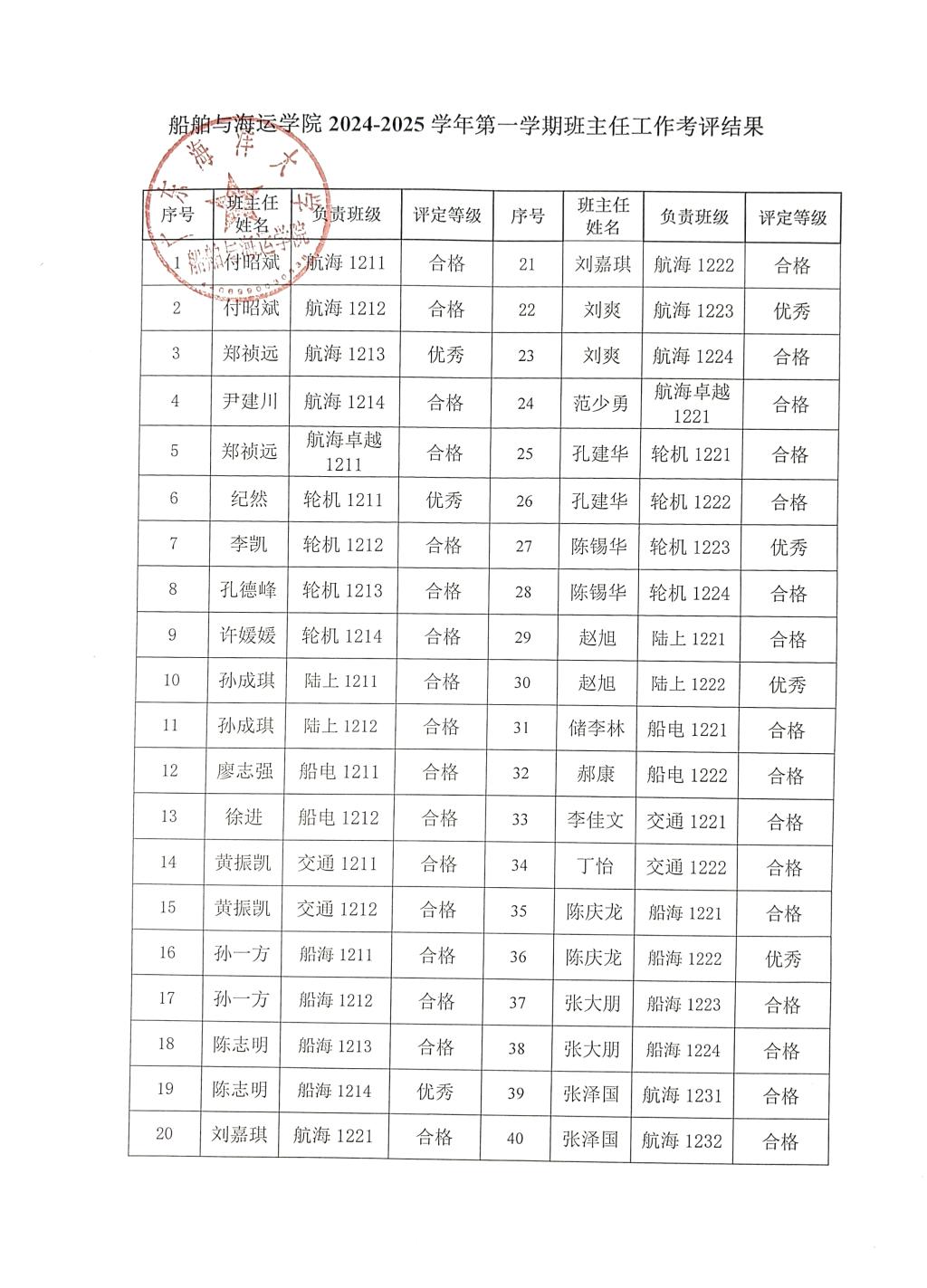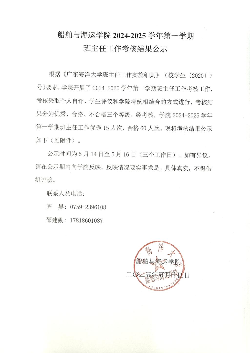 班主任工作实施细则》(校学生〔2020〕7号)要求,学院开展了2024-2025学年第一学期班主任工作考核工作,考核采取个人自评、学生评议和学院考核相结合的方式进行,考核结果分为优秀、合格、不合格三个等级。经考核,学院2024-2025学年第一学期班主任工作优秀15人次,合格60人次。现将考核结果公示如下(见附件)。