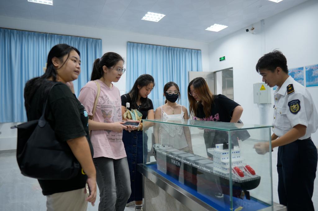 探访的最后一站是船舶模型室,这里陈列着各式各样的船舶模型,从古老的帆船到现代的万吨巨轮,每一艘模型都承载着人类对海洋的探索与征服。同学们在模型前仔细观赏,拍照留念,感受着每一艘船舶背后的故事与情怀。